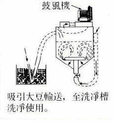 如上圖所示,高壓風機里的葉輪極速運轉,使機器內部抽成真空,風機負壓增強,高負壓使其產生強大的吸力,將高壓風機組裝在清洗槽的上方,利用高壓風機將清洗槽的空氣迅速抽離,使清洗槽形成真空狀態,將管道連接大豆槽,風機吸力通過管道將大豆吸到清洗槽里進行清洗,清洗過后的大豆與水從下面的漏斗排出清洗槽進行過濾,將水過濾掉后,再使用高壓風機進行烘干,就如同烘手機的原理一樣,高壓風機的排風力大將大豆表面的水跡迅速吹干,這樣即提高了效率,也節省了時間。